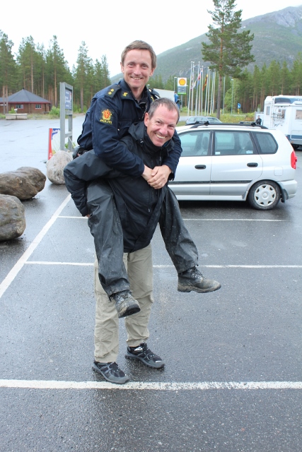 Der strenge Geruch von Surströmming hängt noch im Auto und auch die Hände lassen sich nicht wirklich reinwaschen … aber unser Hochgefühl angesichts der gemeisterten Aufgabe hält an und wurde gleich beim ersten Halt in „Norge“ noch gesteigert: Wir haben die Aufgabe erledigt, ein Foto zu machen, auf dem eines der Teammitglieder einen Polizisten trägt … die Kollegen des Polizisten hatten auch ihren Spaß und wir können eine weitere Aufgabe auf der Habenseite unseres Punktekontos verbuchen. Nun ist als nächstes Narvik unser Ziel – und wir fahren vorgewarnt durch einen der freundlichen Polizisten, dass das Wetter auf den Lofoten schlecht und es dort richtig kalt ist. Möglicherweise müssen wir in Narvik doch noch unser Gepäck um lange Unterhosen ergänzen.