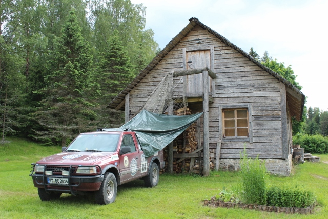 Das Finden ist dann allerdings nicht ganz sooo einfach. Die grobe Richtung gibt das Roadbook vor. Aber in dem Maßstab, den wir brauchen, gibt es vermutlich keine Karte: Wir reden von Feldwegen und noch schmaleren Pfaden. Dennoch: Irgendwann steht an einem Baum das Schild, das uns einen Weg nach „Raudsilla“ weist und wir kommen auf ein Gelände im Wald, auf dem ein paar alte Gebäude und ein riesiges „Zelt“ stehen. Auf den ersten Blick wirken die Gebäude wie eine Art Freilandmuseum.